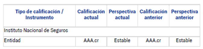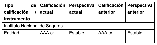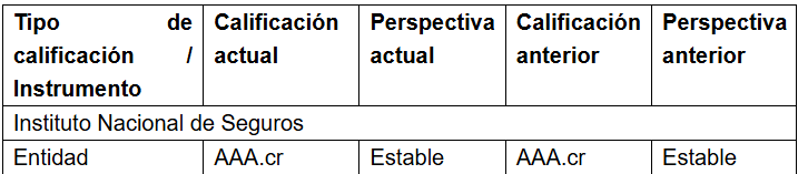SCR Costa Rica an affiliate of Moody’s Local (SCR) otorga la calificación AAA.cr al Instituto Nacional de Seguros (INS). La perspectiva es Estable.